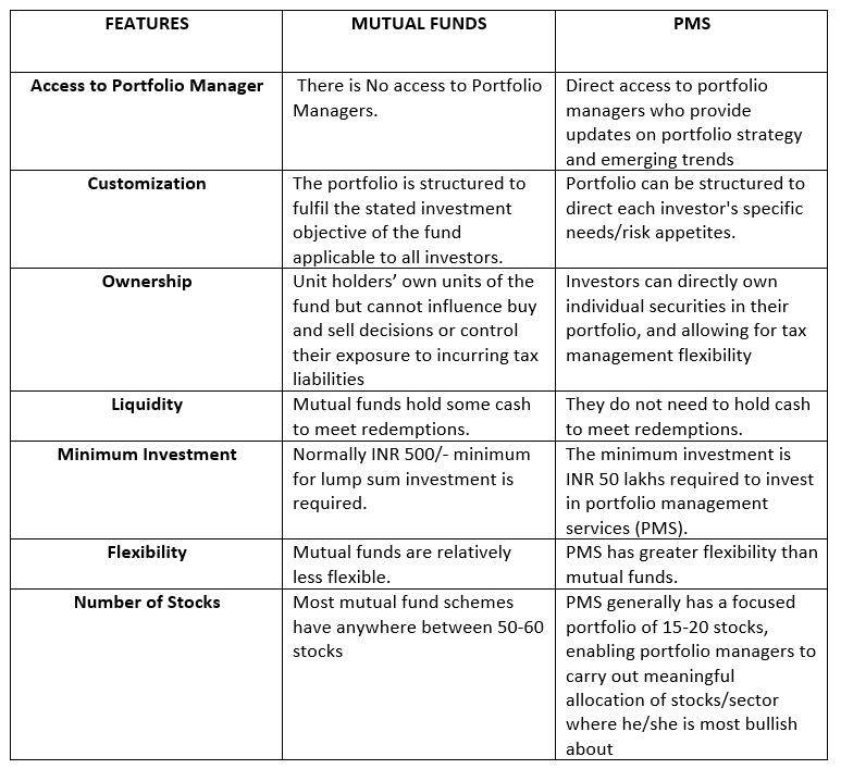 - Independent Portfolios - PMS holdings vary and are not affected by other investor's actions. In general, investors tend to shop in rising markets and selling in falling markets can cause panic. It will also affect other investors. But in PMS, you are the only decision-maker.
